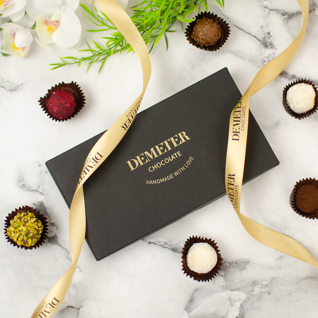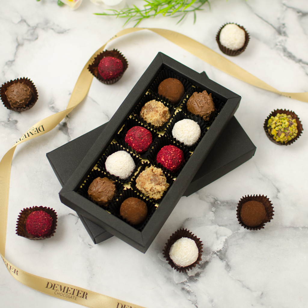 Éld át a Klasszikus Elegancia varázsát bonbonválogatásunkkal, mely időtlen ízeket ölel át. Kóstold meg málnakrémes étcsokis trüffelgolyónkat málnaporral megszórva, majd élvezd a kakaóban hempergetett étcsokoládés trüffelgolyót. Merülj el a mandulás-kókuszos fehércsokoládés és pörkölt mogyorós trüffelgolyóban. A végén pedig ki ne hagyd tejcsokis trüffelünket, mely hagyományos Demeter tejcsokoládéba burkolózva idézi meg a klasszikus ízeket.