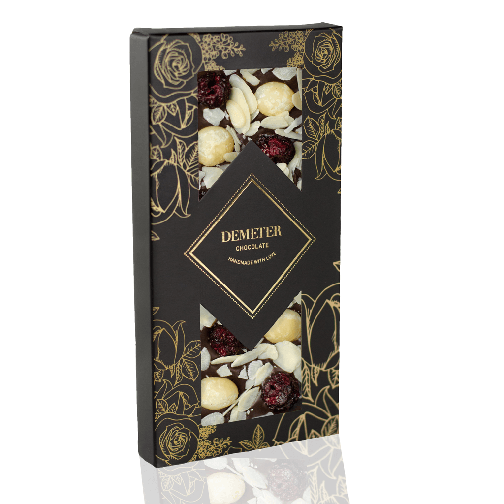 Ez a csokoládé 100% kakaóvajtartalommal és maltitollal készül, garantálva a kirobbanó ízélményt. A mandula és a makadámdió érzéki harmóniája párosul a meggy élénk fanyarságával, mindezt selymes étcsokoládéval ölelve. Egy pillanatra sem fogod tudni levenni róluk a szemedet és a kezedet, miközben élvezed a finom ízek játékát minden falatban.
