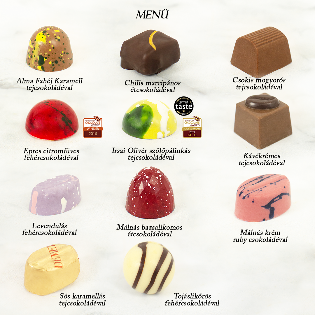 chilis marcipán édes fűszerességét, a pipacsmezők színét idéző epres-citromfüves bonbonok édes bájával ellensúlyozhatod, hogy aztán rögtön erős kábulatba ejtsen a sós karamellás bonbonjaink ellenállhatatlan karizmája. Nincs megállás, egy kis úri kisasszonyos málnás bazsalikomos bájolgás után máris egy szőlődombon találod magad a naplementében, miközben az Irsai Olivér szőlőpálinkás bonbont kóstolgatod. De van még itt Espressoval töltött bonbon is, hogy legyen elég energiád, Ruby-málnás, hogy rózsaszínben lásd a világot, almás-fahéjas-karamellás és tojáslikőrös, hogy egész évben minden nap karácsony legyen. Végül levendulás provance-i andalgással és az ismerős csokoládés-mogyorós ízélménnyel zárhatod a sort.