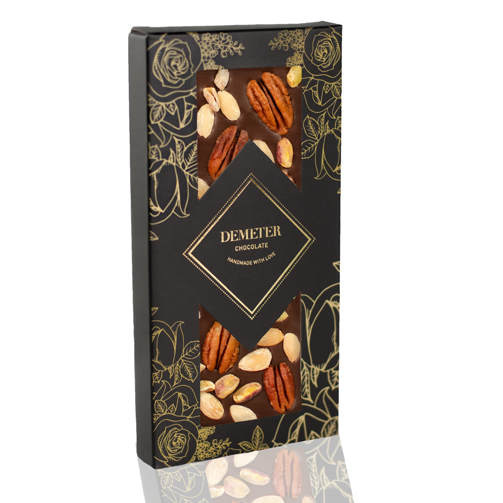 Étcsokoládé pekándióval, mandulával és pisztáciával