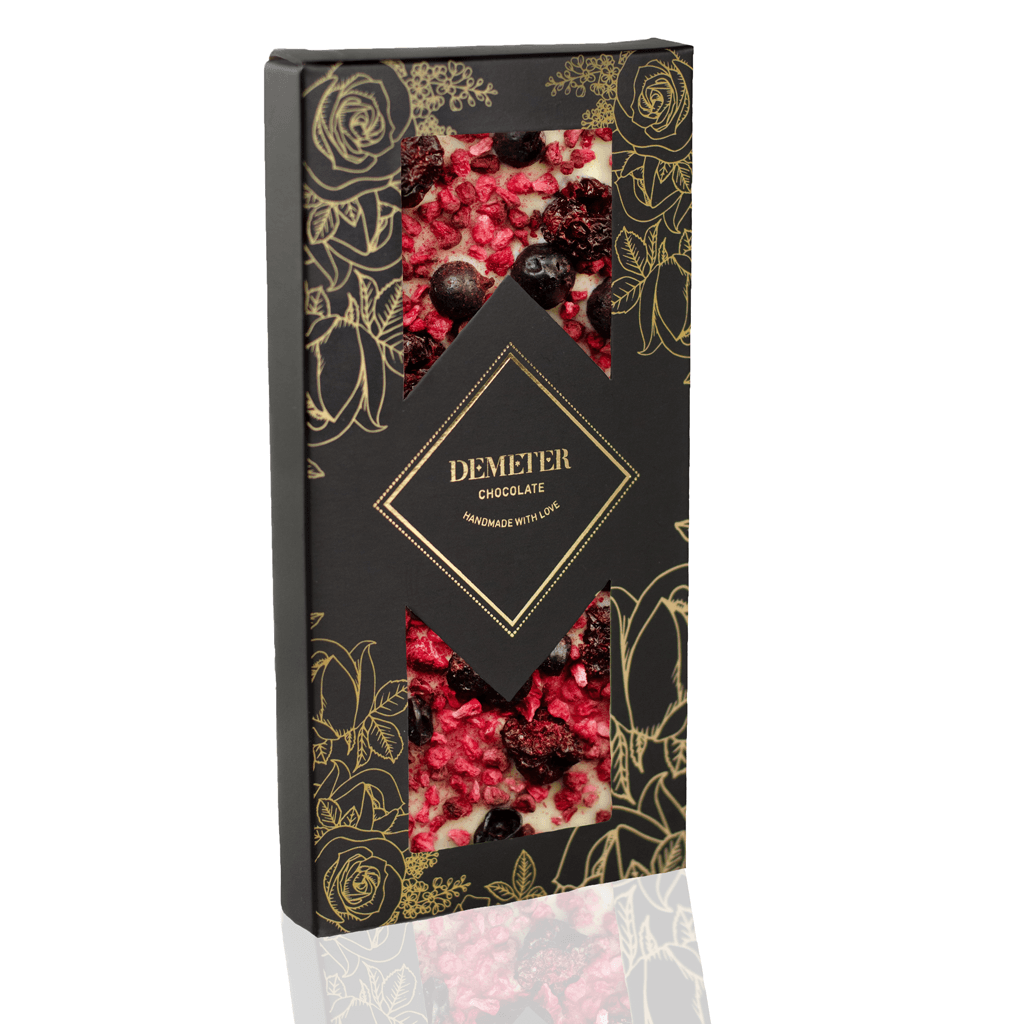 A mindig édes megbízható málna, a fanyar színpompás meggy és a kissé érdes, de nem kevésbé érdekes fekete ribizli kombinálásával született meg ez a táblás csoda azok számára, akik vágynak a letisztult fehér csokoládé nyújtotta örömökre, de vinnének egy kis furfangot is az élvezetekbe.