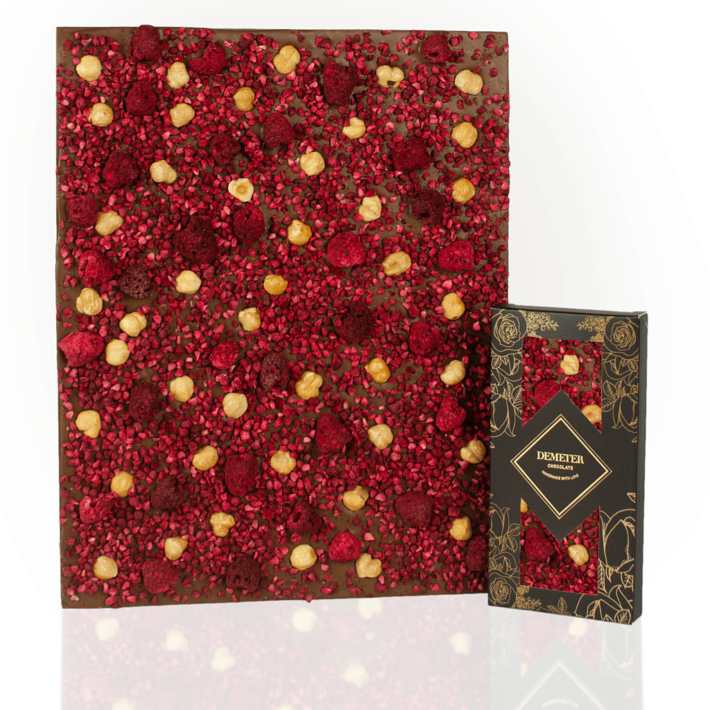 Emeld a négyzet négyzetére a Demeter csokoládéimádatot, és kóstold meg óriás táblacsokoládénkat, amit a selymes és krémes prémium tejcsokoládé, a mindig megbízhatóan bájos, nyáridéző málna, és a hőn szeretett mogyoró kettős tánca varázsol felejthetetlenné. Nagy méret, óriási ízélmény!
